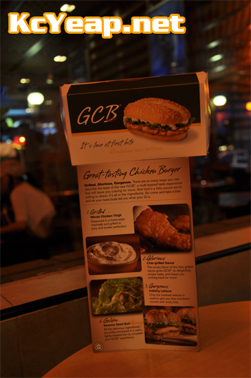 所谓GCB汉堡包就是Great-Tasting Chicken Burger, GCB汉堡包配菜有Grilled Whole Chicken Thigh(鸡大腿) + Gorgeous Iceberg Lettuce(生菜) + Glorious Char-grilled Sauce(烤酱)就是Great-Tasting Chicken Burger(GCB)
