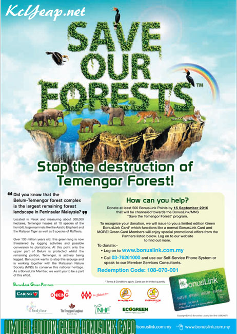 有BonusLink Card吗? 如果你有BonusLink Card, 你可以考虑转变你的卡至Green BonusLink Card. 什么是Green BonusLink Card? 如何得到它? 你只需要捐赠你的500 bonuslink point, 你将拥有Limited Edition Green BonusLink Card. 而你的那500 bonuslink point将捐赠给Malaysian Nature Society (MNS)大马自然学会作为保护霹雳州Belum-Temengor森林(Hutan Belum)的基金.