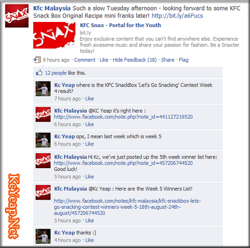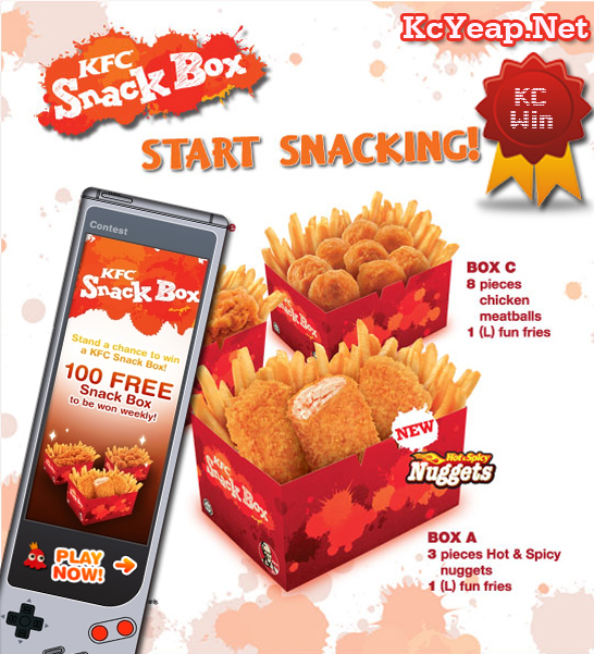 其实此竞赛在8月24日已结束, 成绩一直没有公布, 我几乎忘记它了. 今天看到KFC MalaysiaFacebook推广KFC的产品KFC Snak Box才让我想起 🙂 然后当然去问问看第五周的比赛成绩. 哈哈, 他们也忘记了 🙂 幸亏有我提醒, 否则就当没有了这个事. 也幸亏KFC Malaysia还有保留成绩纪录.